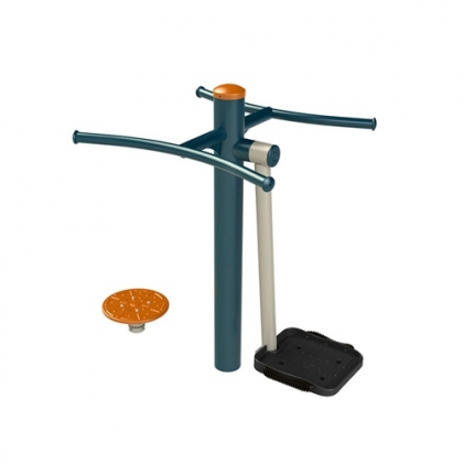 扭腰器:立于脚踏圆盘上,握紧扶手,适度转动身体,钟摆器:双腿并拢在脚踏板上站稳,握紧扶手后,身体适度左右摆动